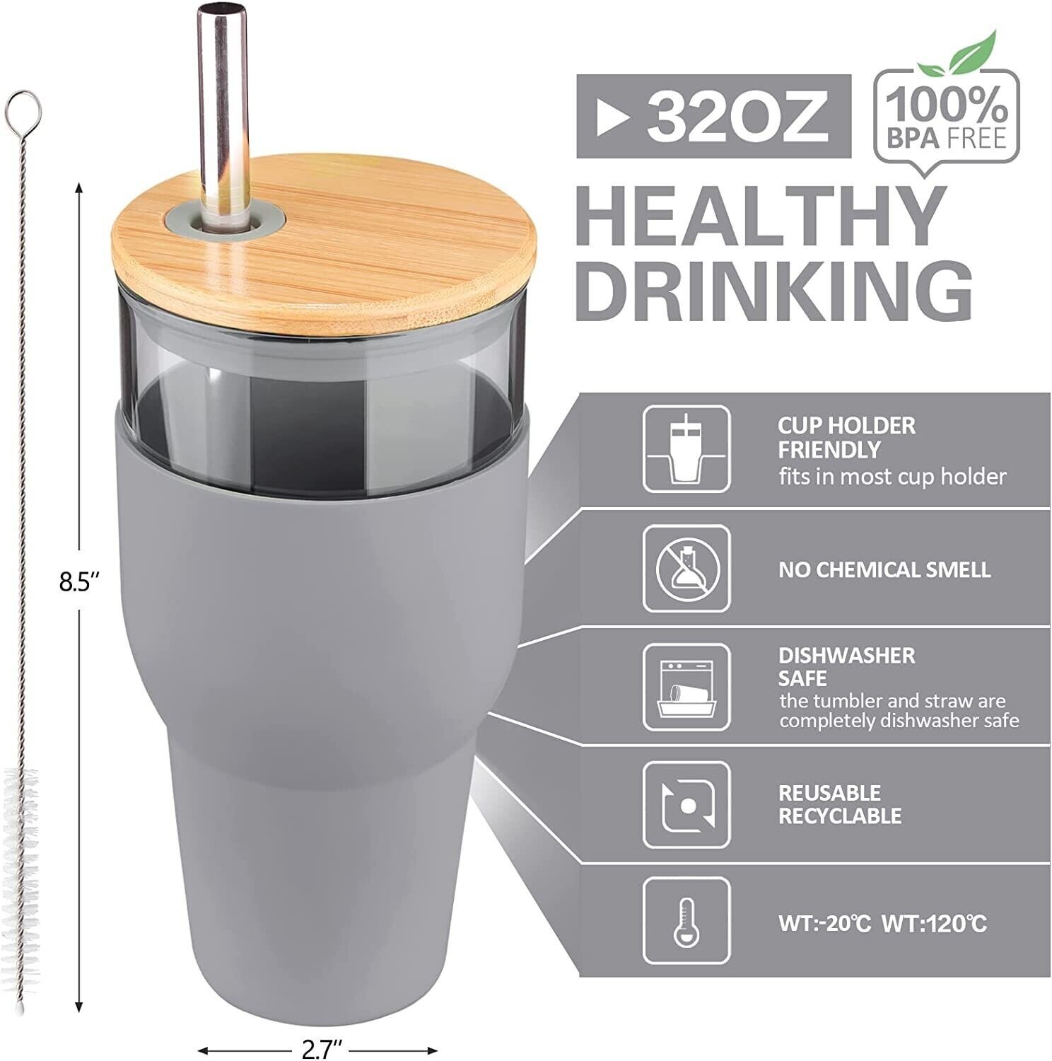 32oz Glass Tumbler with Straw and Lid, Reusable Boba Smoothie Cup (Gray)