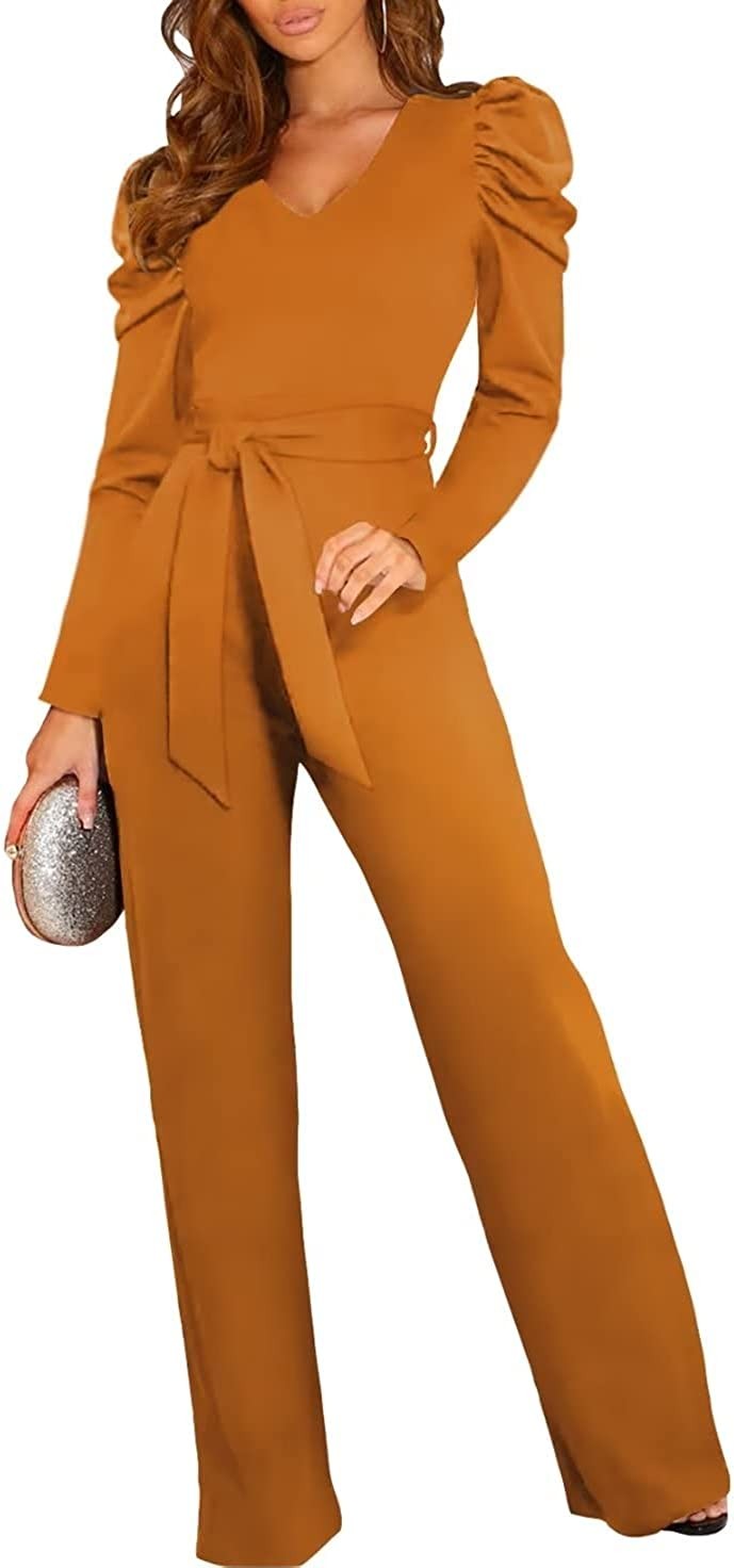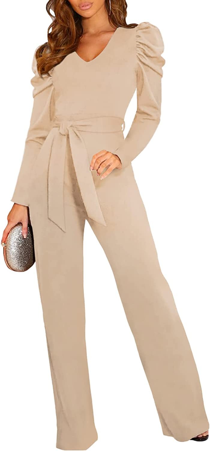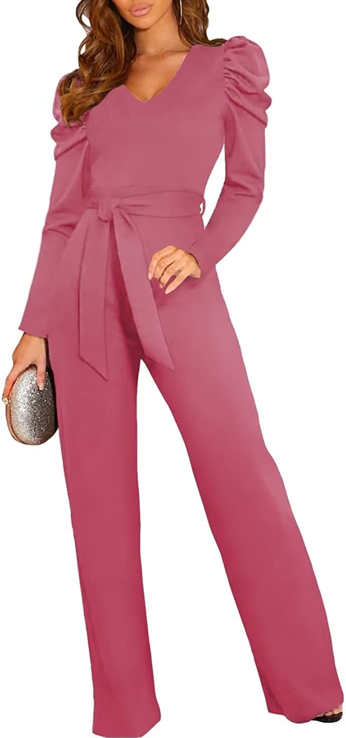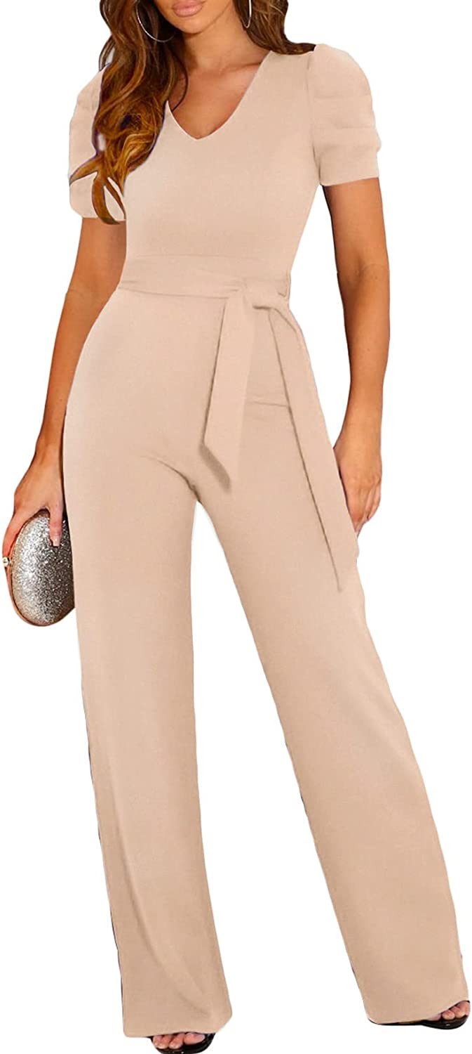 BLENCOT Womens Jumpsuit Short Sleeve Casual v Neck Belted Wide Leg Formal Romper