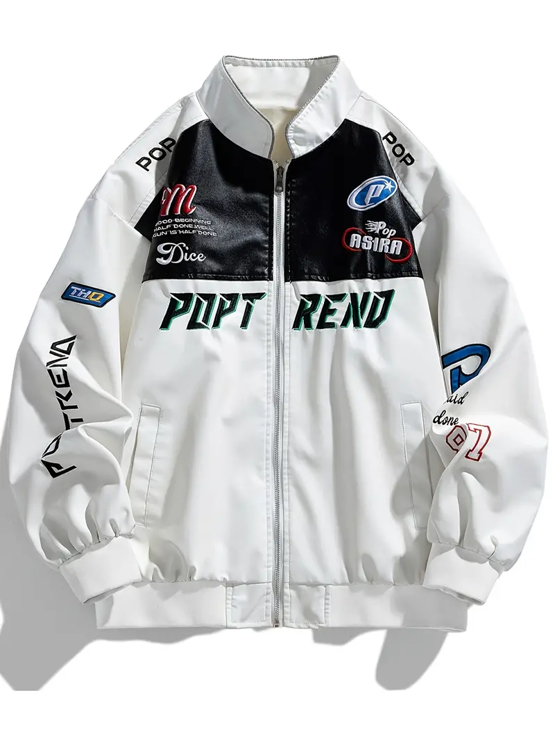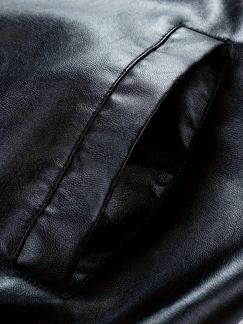 Men's Stylish PU Leather Letters Pattern Jacket With Pockets, Casual Breathable Stand Collar Zip Up Long Sleeve Jacket For Outdoor Activities