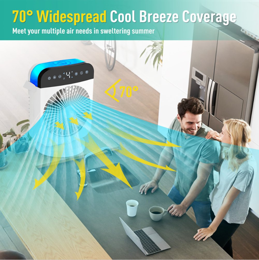 • ❄【Auto Oscillation & Soft Night Light】The air cooler with 70° oscillation design support rotation like a desk fan, circulating air while enlarge cooling area, cooling your surrounding evenly. Soft blue LED light can be used as a night light, unlimited brightness adjustment, which help you with better sleep.