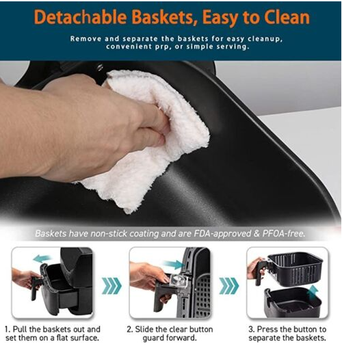 ETL Listed Design and Ease of Cleaning: This dishwasher safe air fryer comes with a non-stick basket and crisper board, both of which are BPA free. It also has ETL security certification.