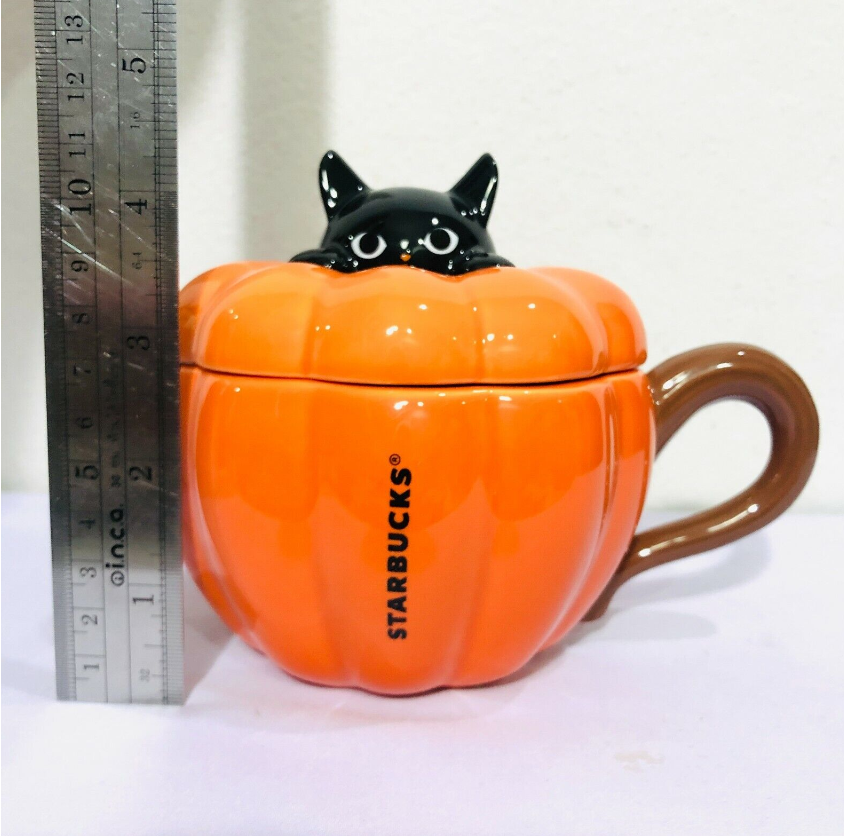 Starbucks Ceramic Mug Halloween Pumpkin 12oz.Lid Black Cat