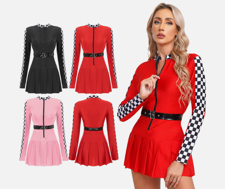 Checkerboard and belt make you a professional racing driver look, while pleated skirt adds a touch of cuteness, stylish and impressive.